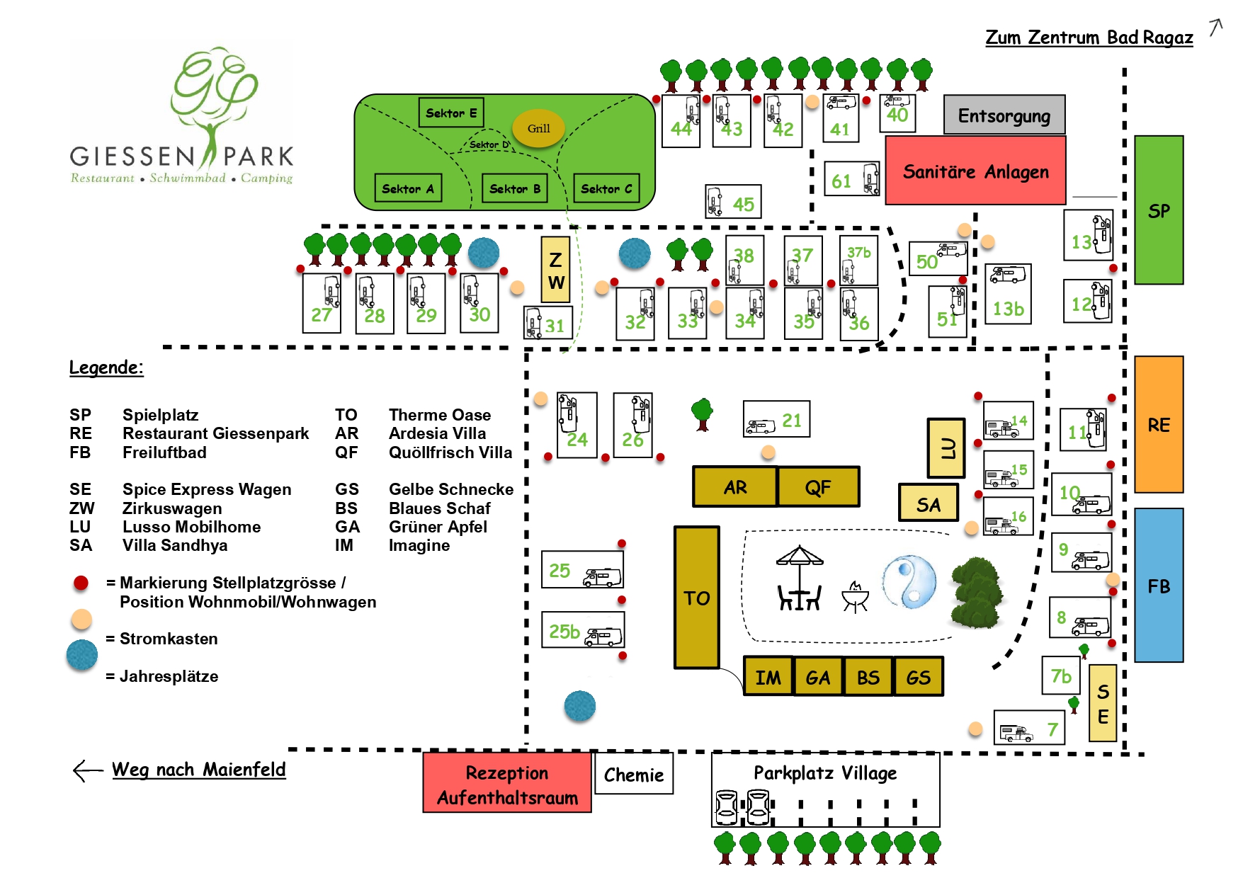 Grün entspannt und tut der Seele gut – so sagt man. Der Camping Giessenpark liegt am Ortsrand von Bad Ragaz im Naherholungsgebiet. Der Campingplatz ist idyllisch in die Natur eingebettet, bietet Sonnen- und Schattenplätze. Spazierwege im Giessenpark mit Giessensee oder entlang dem Rhein, Ausflüge zum Pizol oder Baden im öffentlichen Thermalbad Tamina Therme. Gerne beraten wir Sie für Ausflüge in der Region. In den Sommermonaten erhalten Campinggäste kostenfreien Eintritt ins gegenüberliegende Freiluftbad Giessenpark. Abends geniessen Sie auf unserer Terrasse feines Indisches Essen oder Beliebtes aus Europa oder besuchen Sie eines unserer zahlreichen Konzerte und Veranstaltungen abends im Innenhof.